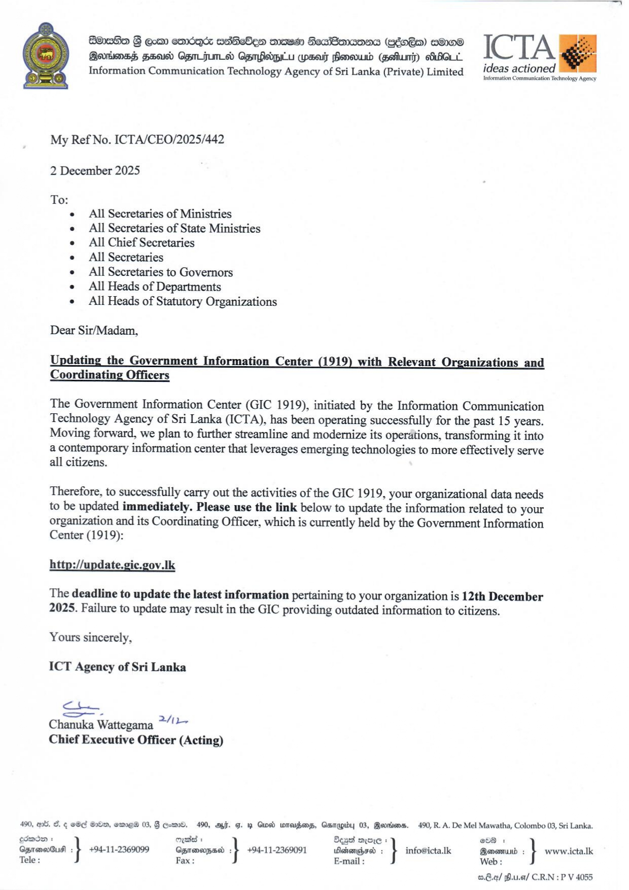The Government Information Center (GIC) is in the process of updating and verifying the directory of designated contact officers across all government organizations. To support this initiative, we kindly request your institution to provide the details of two appointed officer/s who will serve as the primary and secondary contact points for information coordination with the GIC.